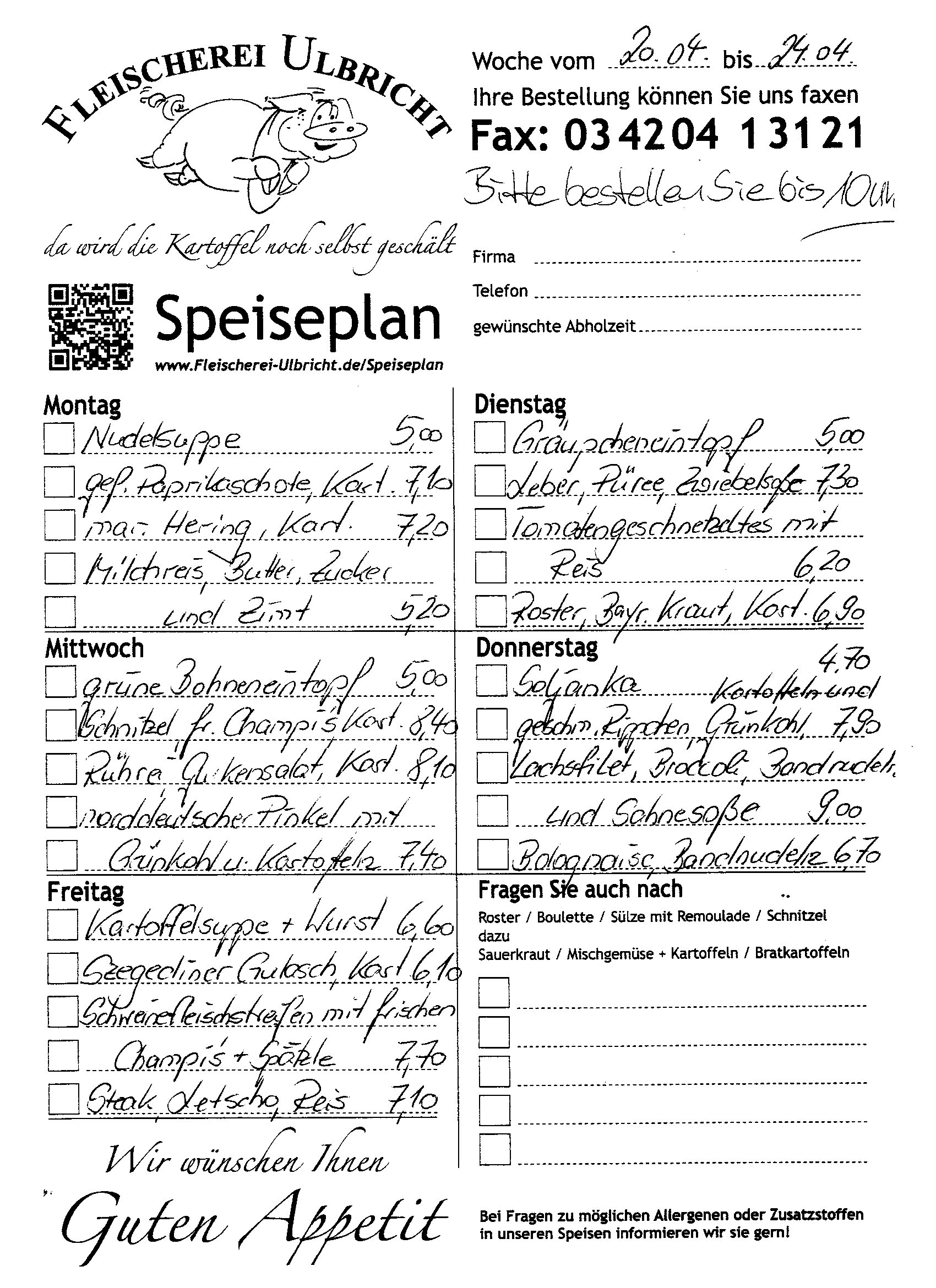 Bitte bestellen Sie bis 10 Uhr. Bitte haben Sie Verständnis, dass wir zwischen 10 und 13 Uhr keine telefonischen Bestellungen entgegen nehmen. Kommen Sie gern direkt bei uns vorbei.