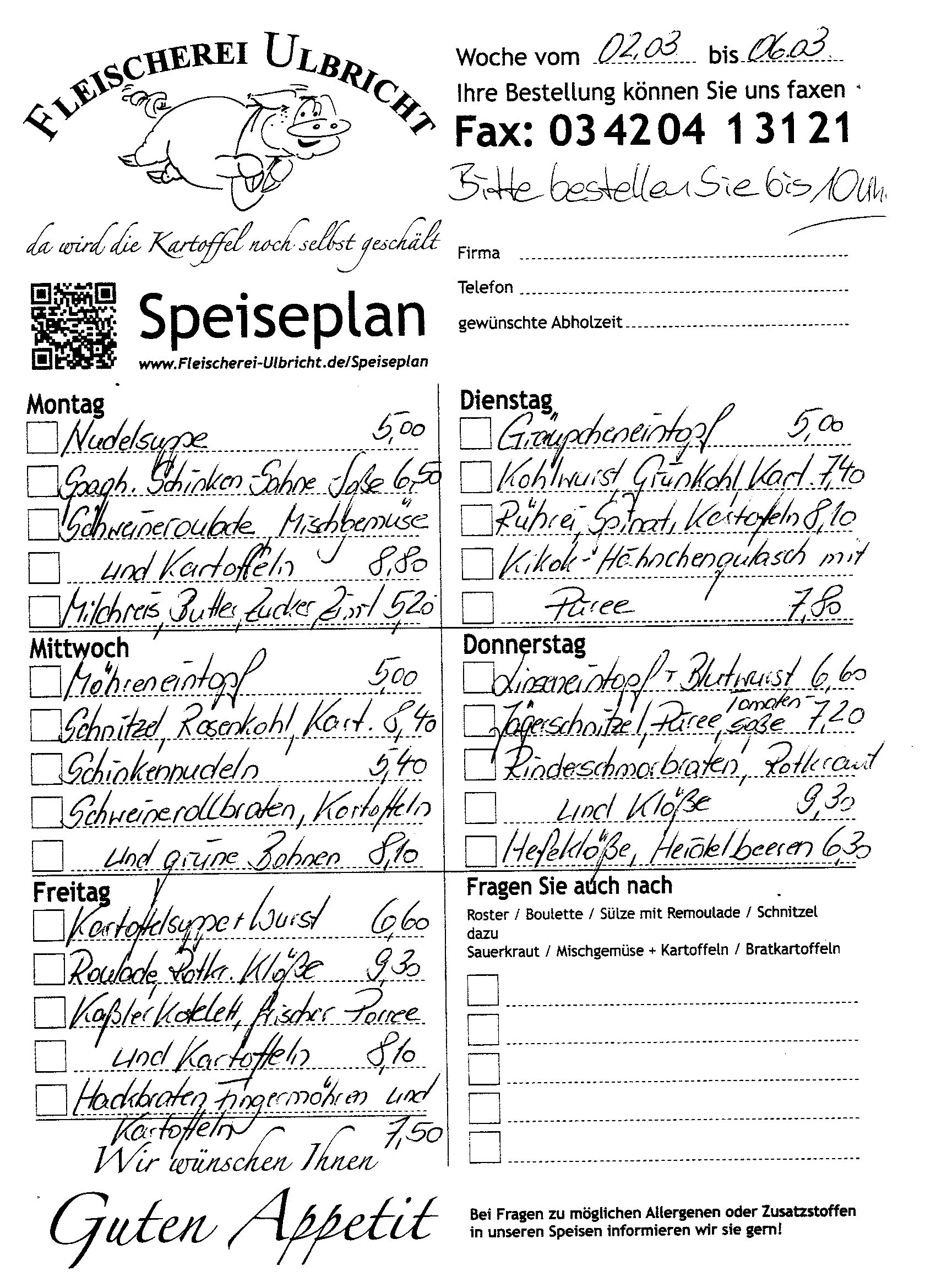Bitte bestellen Sie bis 10 Uhr. Bitte haben Sie Verständnis, dass wir zwischen 10 und 13 Uhr keine telefonischen Bestellungen entgegen nehmen. Kommen Sie gern direkt bei uns vorbei.