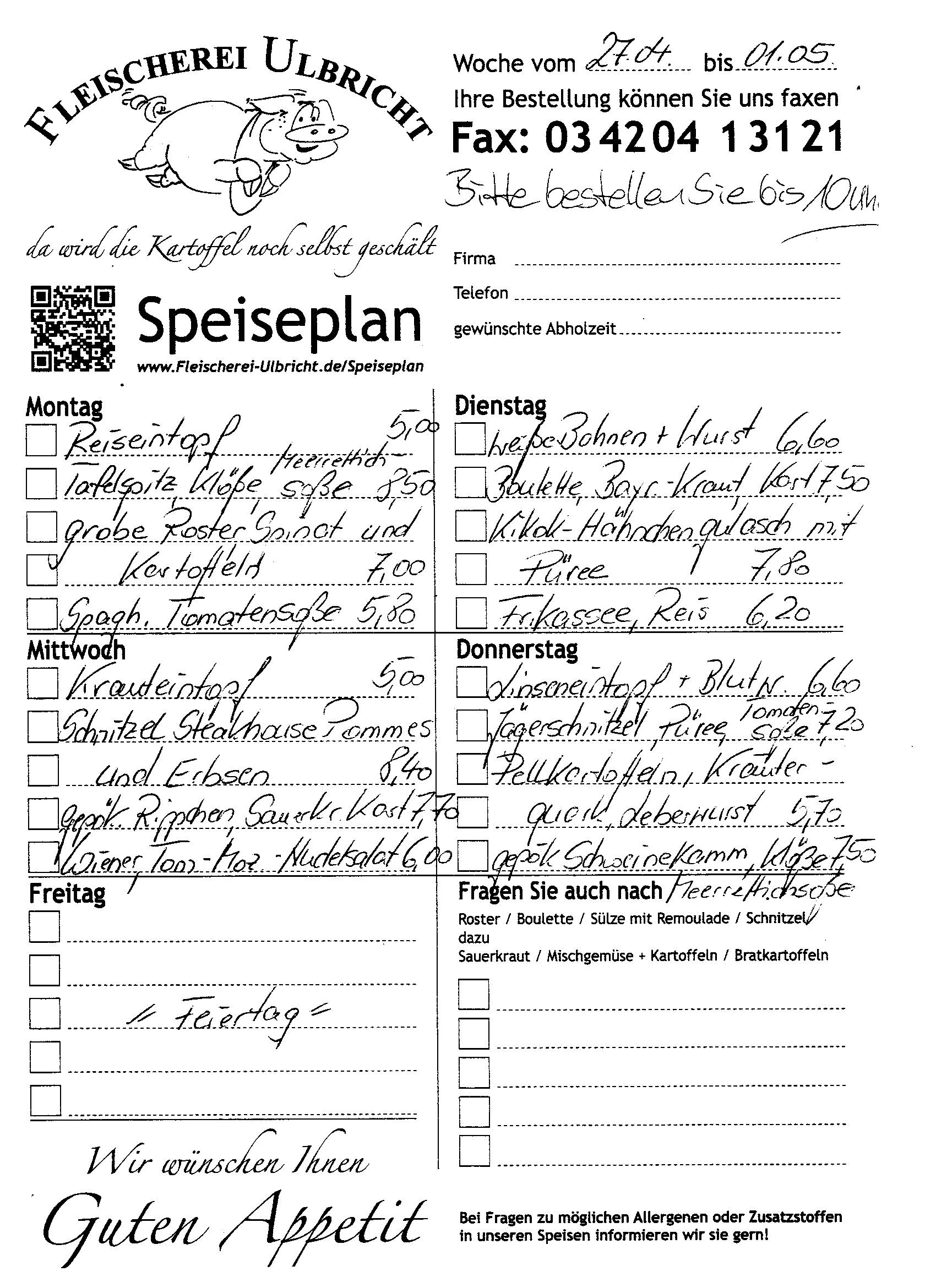 Bitte bestellen Sie bis 10 Uhr. Bitte haben Sie Verständnis, dass wir zwischen 10 und 13 Uhr keine telefonischen Bestellungen entgegen nehmen. Kommen Sie gern direkt bei uns vorbei.